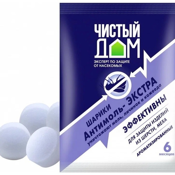 Шарики Антимоль Экстра уничтожают моль и личинки. Два-три шарика достаточно для защиты от повреждений молью в одной секции стандартного платяного шкафа.