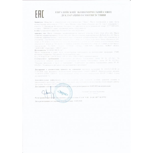 Дата изготовления: 24.01.2025 Срок годности: 24.06.2026 Деревенское нерафинированное оливковое масло Horiatiko Peloponnese (Хориатико Пелопоннес). Категория Extra Virgin, первый холодный отжим. Гречес... Показать описаниекий полуостров Пелопоннес - это райский уголок с яркой и разнообразной растительностью. Большую часть полуострова занимают оливковые рощи. Именно здесь сама природа создала идеальные климатические условия для созревания сочных, маслянистых оливок, из которых изготавливают душистое, насыщенное полифенолами масло. Благодаря упорному труду десятков поколений местных крестьян сегодня мы имеем возможность наслаждаться простым, ароматным, очень мягким оливковым маслом. Регулярное употребление оливкового масла способствует общему оздоровлению и омоложению организма. Оливковое масло Хориатико Пелопоннес обладает природно низкой кислотностью, не превышающей 0.4%. Коробка с краном (Bag-in-box) Очень удобна для использования. За счет того, что масло находится в вакумной упаковке (фольгированный пакет), оно не окисляется и не теряет своих ценных и полезных свойств. Современная асептическая ламинированная упаковка «Bag-in-Box» с краном защищает полезные свойства масла от разрушительного окисляющего воздействия света и воздуха и обеспечивает удобную возможность розлива масла. Состав: оливковое масло нерафинированное (Extra Virgin). Пищевая ценность в 100г продукта: белки – 0 г; углеводы – 0 г; жиры - 92 г. Из них: * насыщенных жиров 13 г, * полиненасыщенных жиров 8 г, * мононенасыщенных жиров 71 г. Энергетическая ценность - 825 Ккал / 3454 кДж. Условия хранения Хранить до и после вскрытия упаковки в защищенном от попадания прямых солнечных лучей месте при температуре не выше 25 градусов Цельсия. При низких температурах возможно помутнение без потери качества. Для восстановления нормального состояния масла, поместите его в условия комнатной температуры. Продукция соответствует требованиям ТР ТС 024/2011 от 09.12.2011. Изготовитель: ECOGREECE 7 Eratiras Str, 56533, Polichni, Thessaloniki, Greece, Греция. Импортер: ООО "ЭВРОС" РФ, 127055, г.Москва, ул.Новослободская, д.20. Объем: 5л. Вес брутто: 5,0 кг. Узнайте больше! О замерзании оливкового масла в холодильнике. Это миф! Еще один миф о жарке на оливковом масле. Об одной столовой ложке оливкового масла в день. Как приготовить настоящий греческий салат 10 фактов об оливковом масле, которые Вас удивят О дегустации оливкового масла. Вкусы и ароматы.