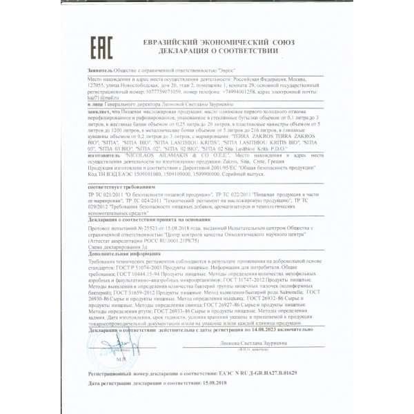 Дата изготовления: 08.10.2024 Срок годности: 30.01.2026 Масло оливковое P.D.O. Sitia 03, о.Крит, Греция, жест.банка, 5л. Фермерское оливковое масло от семьи AILAMAKIS Это оливковое масло первого холод... Показать описаниеного отжима (Extra Virgin) произведено на солнечном острове Крит, на восточной его части, из спелых оливок, собранных в знаменитом на весь мир районе Сития (Sitia). AILAMAKIS - это фамилия, принадлежащая семье критского фермера Николаоса Айламакиса, который владеет оливковыми рощами и небольшим производством оливкового масла. В Греции принято ставить свою фамилию на производимый продукт как гарантию стабильно высокого качества, за который отвечает не только сам фермер, но и вся его большая семья. В традиционном укладе Крита репутация семьи играет определяющую роль для признания обществом и успеха в бизнесе. Сорт оливок Коронейки Для изготовления оливкового масла Sitia 03 используются оливки сорта Коронейки. Это мелкие зеленые оливки, которые не используются в пищу, а лишь только для отжима масла. Кроме прекрасного свежего вкуса, эти оливки обладают очень важной особенностью - масло из них стабильно сохраняет все витамины и низкую кислотность на протяжении всего срока годности. А низкая кислотность - это один из показателей высокого качества оливкового масла. Кислотность оливкового масла Sitia 03 Оливковое масло Sitia 03 обладает очень низкой кислотностью - менее 0.39%. Для справки. Оливковое масло с кислотностью менее 0.8% называется extra virgin, а с кислотностью менее 0.5% считается лечебным. Органолептические характеристики оливкового масла Sitia 03 Масло имеет золотисто-зеленый оттенок, обладает приятным ароматом свеже скошенной травы и длительным послевкусием с фруктовыми нотками. Применение оливкового масла Сития 03 Оливковое масло P.D.O. Sitia 03 рекомендуем применять в качестве лечебного и профилактического средства, небольшими порциями. Также это масло дополнит салат из свежих овощей и зелени, соединит воедино компоненты блюда и гармонизирует вкус. Protected Designation of Origin (P.D.O.) from Sitia of Crete Обозначение на этикетке PDO Sitia Lasithiou Kritis / PDO Сития Лассити Крит (P.D.O.) – знак защищенного наименования места происхождения) означает, что это масло произведено в регионе Сития острова Крит. Сития - один из самых известных в мире регионов, производящих оливковое масло высшего качества. Эксперты объясняют этот факт исключительным географическим положением региона, особенностями местного климата и почвы. Приведем лишь одну цифру - в регионе Сития насчитывается более 3000 солнечных часов в год! А это означает, что оливки успевают полностью созреть и приобрести необыкновенный вкус и аромат. Оливковые рощи Ситии Наша дегустация оливкового масла Sitia 03 Состав: 100% оливковое масло первого холодного отжима (extra virgin). Пищевая ценность в 100г продукта: Энергетическая ценность: 824 кКал / 3389 кДж белки – 0 г; углеводы – 0 г; жиры - 92 г. Из них: * насыщенных жиров 13 г, * мононенасыщенных жирных кислот 73 г, * полиненасыщенных жирных кислот 6 г. Условия хранения: Хранить в прохладном и темном месте при температуре не более 25 градусов Цельсия. При низких температурах возможно помутнение. Для восстановления нормального состояния масла поместить его в условия комнатной температуры. Объем жестяной банки: 5 л. Вес брутто: 5 кг. Производитель: NIKOLAOS AILAMAKIS CO & O.E.E Zakros, Sitia 72300, Crete Greece. В коробке 4 жестяных банки объемом 5л. Узнайт