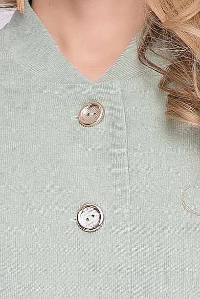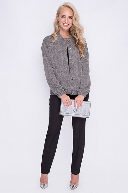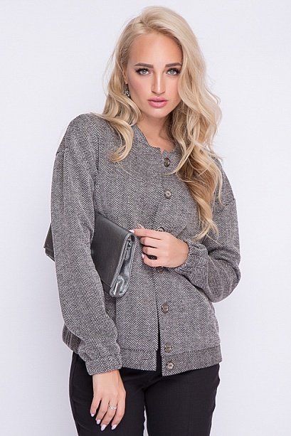 Бомбер из трикотажа в елочку.Воротник стойка.По центру изделия застежка на пуговицы.Притачной пояс с резиной по бокам. По полочкам обработаны боковые прорезные карманы с листочкой.
