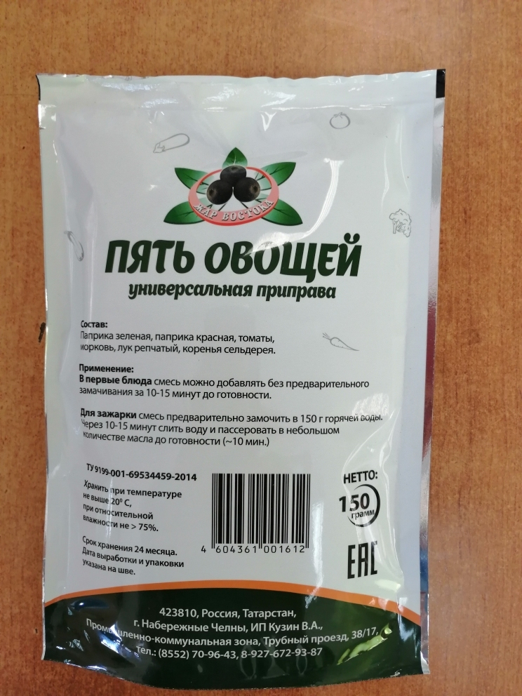 Состав: желатин, морковь, лук, куркума, кориандр, чеснок, перец зеленый, перец красный, глютамат, соль.