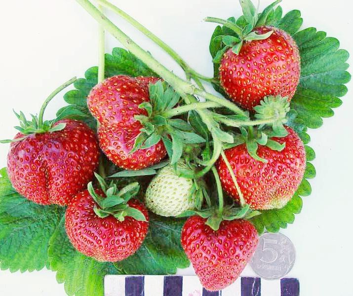 Раннеспелый сорт с крупными и сладкими плодами. Кусты высокие и мощные, полураскидистые, с толстыми цветоносами. Цветение обильное, цветки крупные, белоснежные, середина – ярко-жёлтая. Плоды. Одинаков... Показать описаниеые по размеру. Средний вес – 30-40 г. Отдельные экземпляры достигают 50 г. Цвет созревающих ягод – красный, по достижении технической спелости – тёмно-вишнёвый. Сорт не подвержен заболеваниям корневой системы, толерантен к пятнистостям листьев.