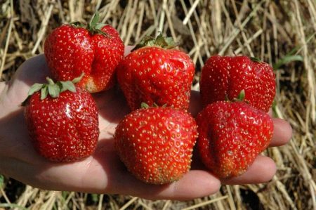 Средне поздние сорта. Сорт среднепозднего срока созревания. Кусты сильнорослые, высокие, компактные, густооблиственные. Растения сильно кустятся и не переносят загущенного размещения. Листья тёмно-зел... Показать описаниеёные, однотонные, с угольным оттенком, слабоблестящие. Усообразовательная способность – средняя. Ягоды клиновидные или округло-конические, часто угловатые, тёмно-красные, блестящие, с глубоко погружёнными в мякоть семянками. Ягоды первых сборов 18-20 грамм, в среднем масса их достигает 9-10 грамм. Мякоть тёмно-красная, плотная, сочная, сладко-кислая, ароматная, с привкусом лесной земляники. Ягоды обладают высокими вкусовыми качествами и отличными технологическими свойствами. Транспортабельность высокая. Пригоден для потребления в свежем виде, переработки и замораживания. Зимостойкость средняя, но растения отличаются хорошей восстановительной способностью и даже при значительномподмерзании дают хорошие урожаи. Засухоустойчивость средняя. Жаростойкость пониженная. Сорт устойчив к вилту. Во влажные годы в значительной степени поражается серой гнилью плодов. Слабо поражается мучнистой росой.