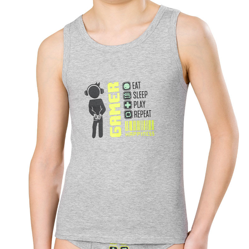 Состав: 100%хлопокОписание: Если вы в поисках качественного, комфортного и стильного белья для своего ребёнка, обратите внимание на нашу майку из 100% хлопка для мальчика. Натуральный состав ткани обе... Показать описаниеспечивает изделию мягкость и воздухопроницаемость — кожа ребёнка дышит. Модель комфортно сидит по фигуре, её можно надевать под рубашку, джемпер, свитер. Горловина и проймы изделия обработаны в тон изделия — они хорошо держат форму, мягкие, надолго сохраняют аккуратный внешний вид. Майка представлена в актуальном оттенке "серый меланж". Практичный и универсальный, он великолепно сочетается с любой одеждой. Модель украшает забавный принт геймерской тематики — понравится любому мальчишке! Перевод: "есть, спать, играть, повторять. Счастье". Принт эластичный и прочный — отлично переносит частые стирки. Такая майка идеальна для повседневной носки, а также для отдыха. Станет замечательным подарком, который способен вызвать искреннюю радость у каждого ребёнка, оставив незабываемые воспоминания о любом празднике и принося массу удовольствия каждый