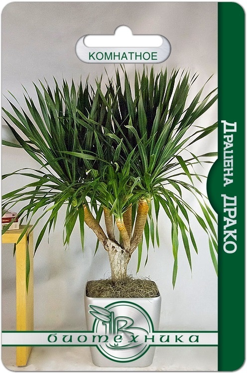 В природе Драцена Драко произрастает на Канарских островах, Мадейре и в Марокко. Это медленно растущее древовидное растение. Ствол серебристо-серого цвета. При надрезе коры из ствола выделяется клейки... Показать описанией сок, краснеющий на воздухе – так называемая “драконова кровь”. Листья жесткие, кожистые, линейно-мечевидные, серо-зеленого цвета, собраны в пучки на концах ветвей. Культивируется как декоративное растение в открытом грунте в странах с теплым климатом, либо как комнатное растение. Посев: углубить семена в грунт на глубину 0,5-1 см. Грунт не должен быть переувлажнен или пересушен. Накрыть пленкой или стеклом. Прорастание: не дружное, от 30 до 180 дней при температуре +25-30°С. Пикировка: подросшие до 4-5 см сеянцы рассаживают в горшки диаметром 5-8 см и переносят на постоянное место выращивания. Молодые, активно растущие растения переваливаются 2 раза в год по мере того, как они перерастают свой горшок. Взрослые растения пересаживают 1 раз в 5 лет. Корневая система Драцены не переносит переувлажнения, поэтому необходимо наличие дренажа. Уход: Использовать рыхлый грунт из двух частей перегноя и одной части песка, либо готовый грунт для драцен. Разместить на хорошо освещенном месте. Полив только после высыхания грунта – не допускать переувлажнения. Отлично переносит засуху.