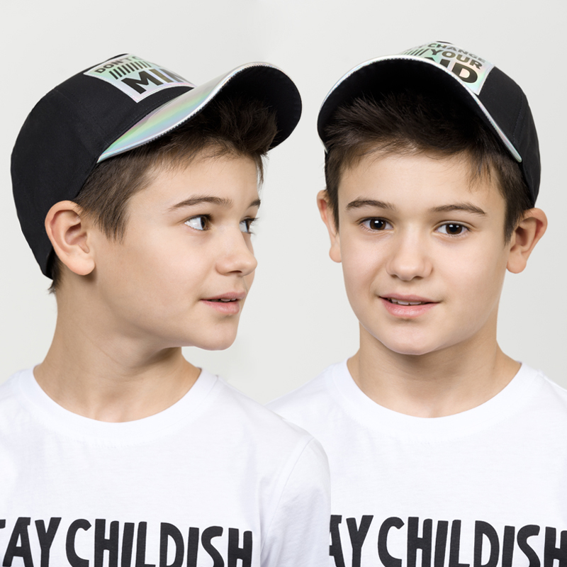Состав: 100%хлопокОписание: Кепка для мальчиков. Верх козырька кепки и нашивка из блестящего голографического материала. Перевод Не меняй свой разум и свое сердце.