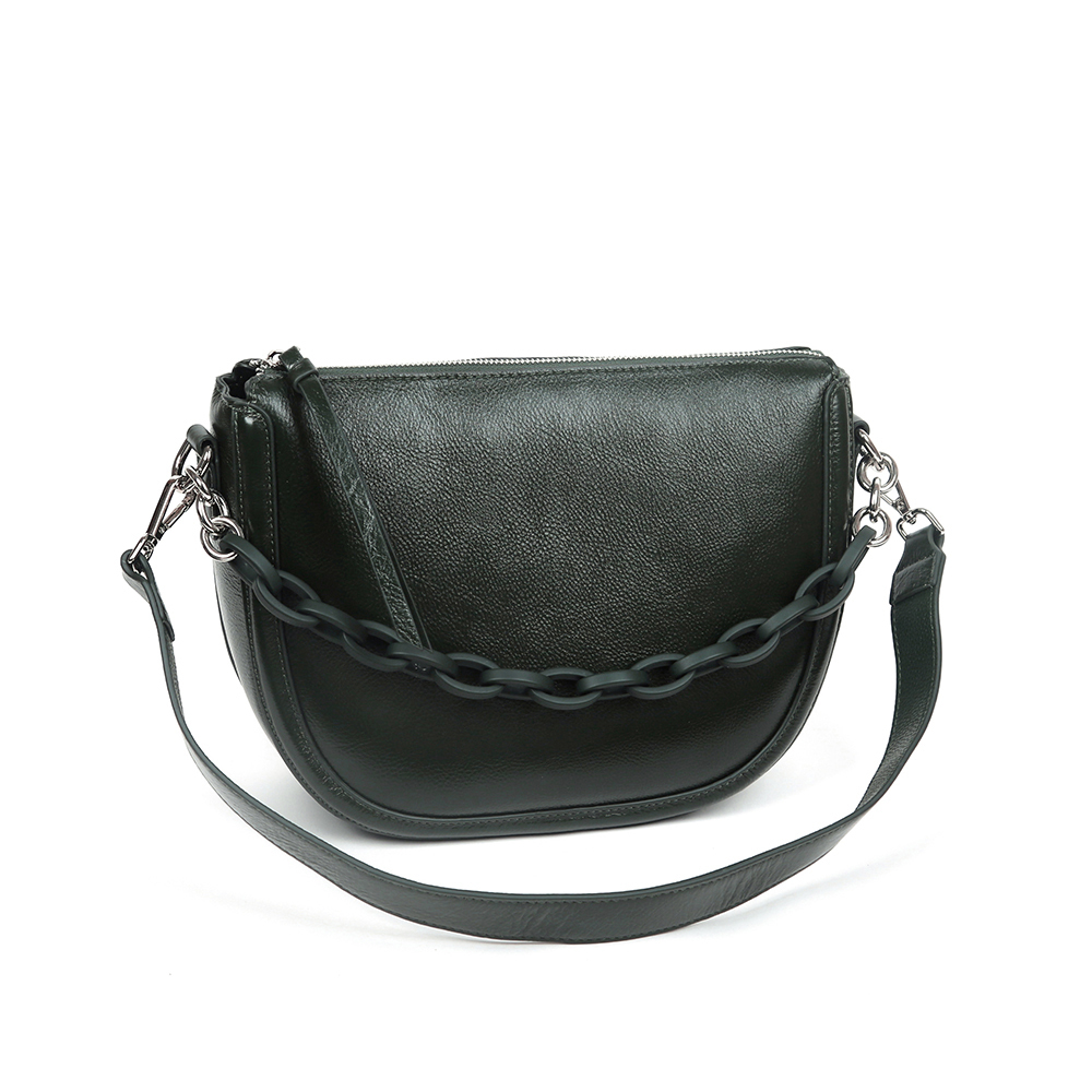 Вместительная сумка-хобо MIRONPAN из натуральной зернистой кожи в темно-зеленый цвете многофункциональна и практична. Основное отделение закрывается на молнию с кожаным поводком. Внутри 3 боковых карм... Показать описаниеана для мелочей: один открытый и два на молнии. На лицевой стороне предусмотрены 2  кармана  на молнии ,соединены цепью- поводком. На тыльной стороне расположен карман быстрого доступа на молнии.  Два удобных съемных  ремня кожаный и текстильный  позволяют менять образы. Фурнитура под серебро гармонично дополняет дизайн изделия. Вместительный размер позволяет носить с собой папки и документы формата А4, а также любимые гаджеты и ежедневники. Цвет фурнитуры - серебро. Вес 1,100 Размер: 34 x 26 (с ремнём 32-46) x 11 cm ( длина x высота x ширина)