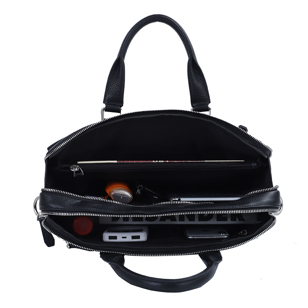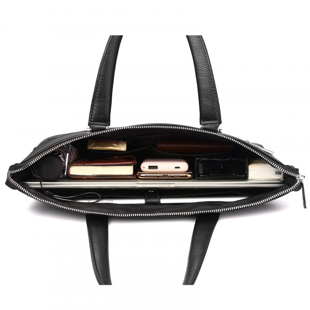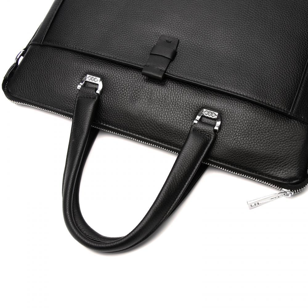 Стильная мужская сумка для документов MIRONPAN выполнена из натуральной зернистой кожи черного цвета. Модель имеет две ручки и съемный плечевой ремень, длина которого регулируется, ширина - 3 см. На т... Показать описаниеыльной стороне также предусмотрен карман быстрого доступа на молнии. Основное отделение закрывается на молнию с кожаным поводком. Внутри расположены органайзер для ручек, 3 кармана для мелочей: 2 открытых и на молнии, а также секция с мягкой стенкой для гаджетов. Сумка вмещает формат А4. Цвет фурнитуры - серебро. Вес 1100 Размер 309х 28 х 6,5 (длина х высота х ширина)